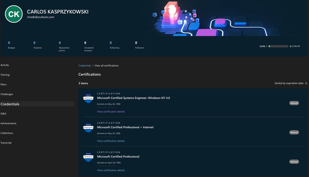 Microsoft certifications from 1998 (surprised they keep a record of those!)